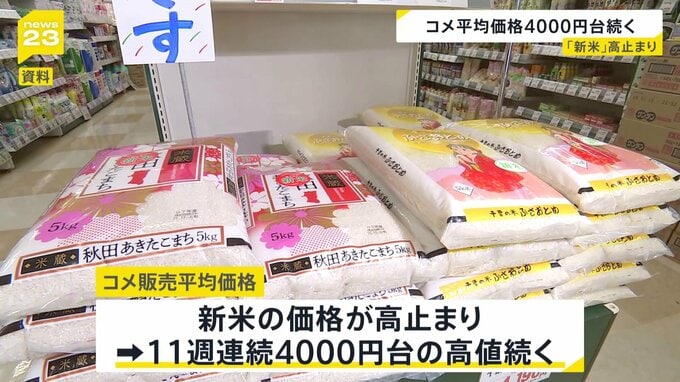 コメの平均価格が3週間ぶりにわずかに値下がりしました。ただ、依然として4000円台の高値です。農林水産省によりますと、今月16日までの1週間に全国のスーパーおよそ1000店舗で販売されたコメ5キロあたりの平均価…