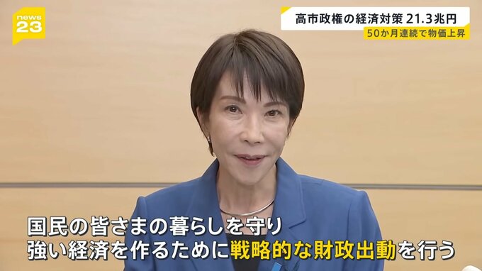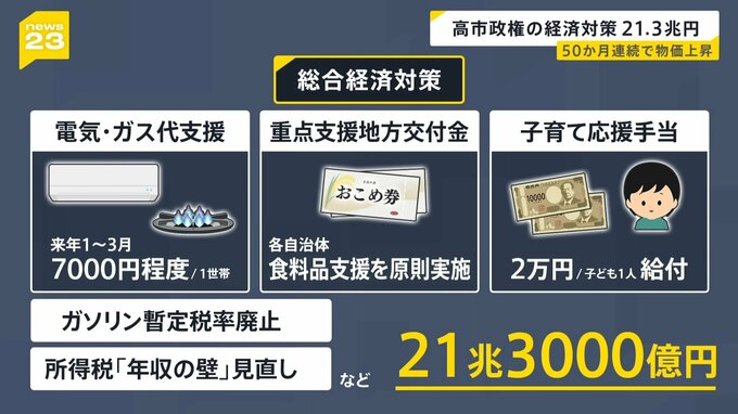 ガソリン暫定税率の廃止など減税策を含めて、経済対策の規模は総額21兆3000億円に上り、コロナ禍以降、最大となります。