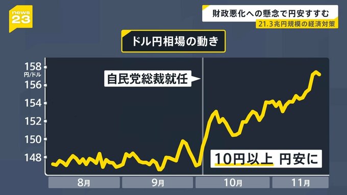 高市氏が自民党の総裁になってから1か月半で、10円以上円安が進んでいます。