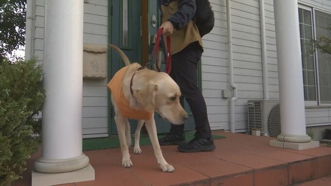 玄関から元気よく飛び出したのは「ゴールデン・レトリバー」と「ラブラドール・レトリバー」のオスのミックス犬・レイ2歳と飼い主の田中薫先生。