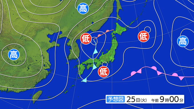 3連休明けは荒れる天気のところも 低気圧が日本海を通過 25日(火)は日本海側を中心に急な強い雨や落雷に注意を 雨と風シミュレーション 北陸放送 2025年11月22日(土) 18:50 国内 3連休明けの25日(火)には日本海を低気圧が進み、北陸など日本海側の地域を中心に雨の降るところが多い見込みです。 荒れる天気になりそうで、急な強い雨や落雷などに注意が必要です。 25日午前9時の予想天気図です。低気圧が発達しながら日本海を進むでしょう。 25日(火)午前9時の予想天気図 低気圧の通過にともない前線に向かって暖かく湿った空気が流れ込み、大気の状態が不安定になりそうです。
