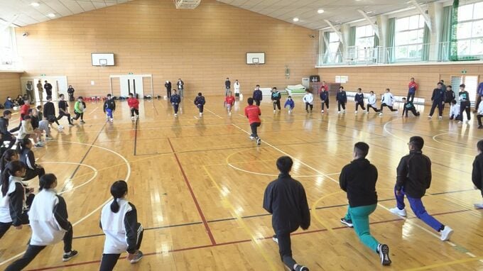 生徒たちは音楽のリズムに合わせながらウォーミングアップをしたりボールを使ったゲーム形式のリレーをしたりして一流選手から体の動かし方などを学んでいました。