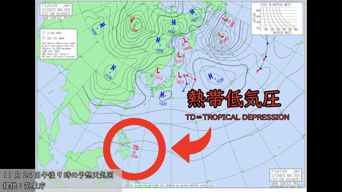 あす(24日・午後9時)の予想天気図【画像④】では、TD=熱帯低気圧に発達する見込みだということです。