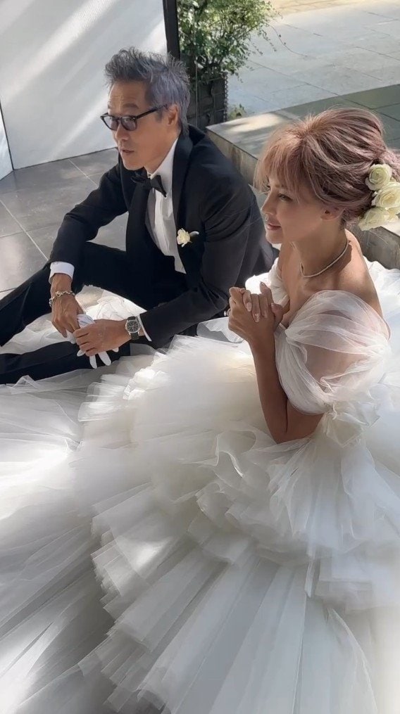 投稿では、白いウェディングドレス姿の梅宮さんと、黒いタキシード姿の夫でアートディレクターの世継恭規さんが並んで座る様子が映し出されています。