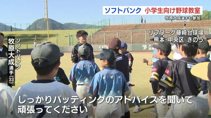 プロ野球・ソフトバンクの選手たちが、小学生と交流する野球教室が熊本市で開かれました。ソフトバンク 牧原大成選手(33)「しっかりバッティングのアドバイスを聞いて頑張ってください」この野球教室は、ソフト…