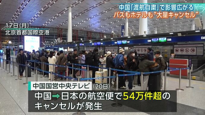 中国国営テレビは、渡航自粛の呼びかけにより、日本に向かう航空便で54万件を超えるキャンセルが発生したと報じています。