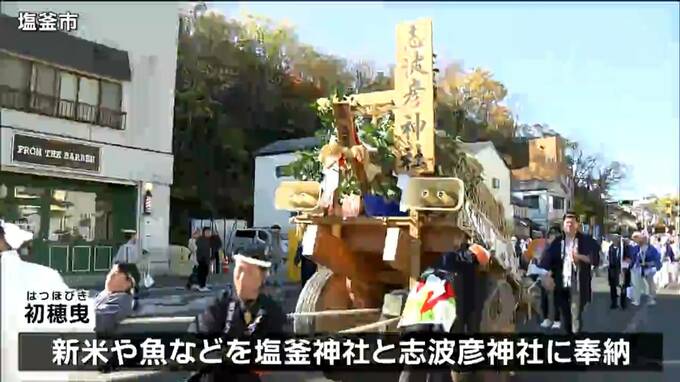 塩釜市で行われた初穂曳は、五穀豊穣を願い、新米や魚などを塩釜神社と志波彦神社に奉納する行事で、今年で33回目です。