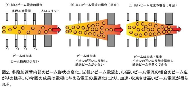 研究グループは「ビーム」を加速させる装置の電圧を最適に調整することで、この「渋滞」を解消しつつ、「ビーム」を集中的にプラズマへ打ち込む、新しい技術を開発しました。