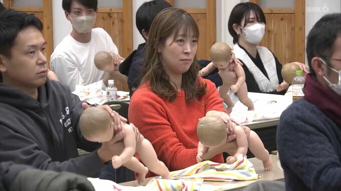 まもなく赤ちゃんを迎えてママとパパになる人が赤ちゃんと一緒に安心して生活がスタートできるよう体験を通して考える育児セミナーが岡山市北区で開かれました。