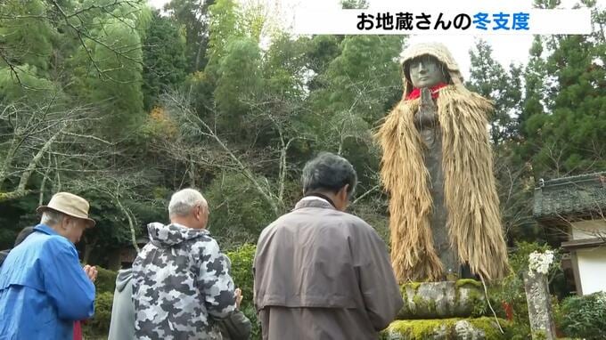 本格的な冬の訪れを前に、京都府京丹後市の平智山地蔵院では、お地蔵さんに蓑などをかぶせる恒例行事が行われました。 高さ5mあまりの大きなお地蔵さん。宮津藩に対し一揆を起こして処刑された吉田新兵衛らの霊…