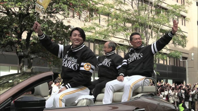 先頭の車両には、チームを2年連続のリーグ優勝と5年ぶりの日本一に導いた小久保監督と選手会長の周東選手、孫オーナーが乗り込みました。