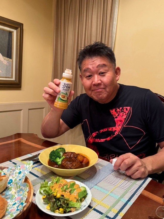 花田さん自身が食事をとる様子も投稿されており、コブサラダドレッシングのボトルを手に持ち、家庭的な雰囲気の中で食事を楽しんでいる姿が写っています。