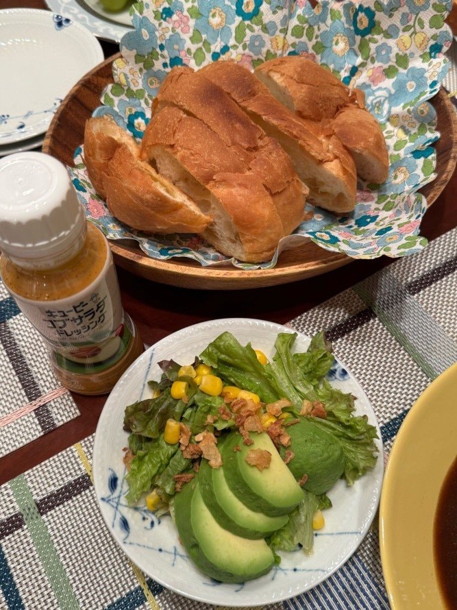 また別の写真では、木製の器に花柄の紙を敷いて盛られたバゲットと、レタスにアボカドのスライス、コーンなどのトッピングが載ったサラダも確認できます。サラダには「コブサラダドレッシング」をかけたと花田さんは説明しています。