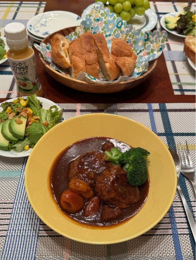 公開された写真からは、黄色い器に盛られたハンバーグシチューにブロッコリーが添えられ、チェック柄のランチョンマットの上に食事が並べられていることがわかります。