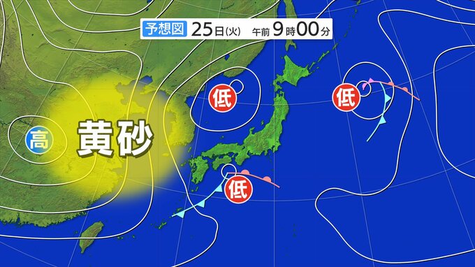 25日(火)には前線を伴った「低気圧」が、本州を通過します。この前線の後ろには「黄砂」控えていて、雨のあと、日本に流れ込む見込みです。