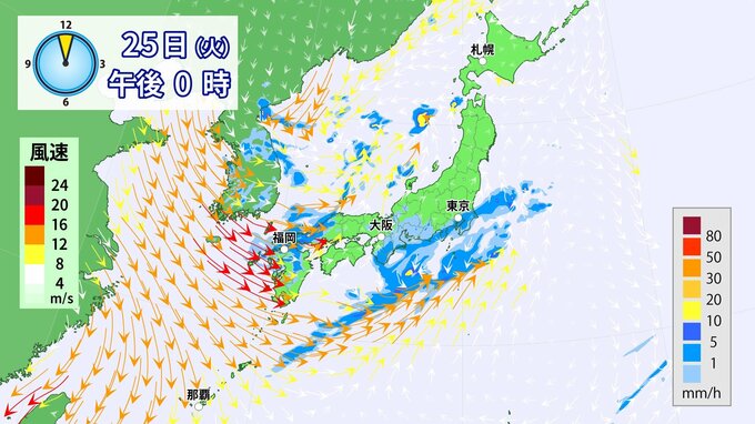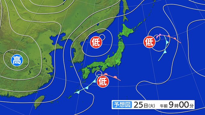 3連休明けの25日(火)は、本州を挟むように2つの低気圧が東へ進む見込みです。