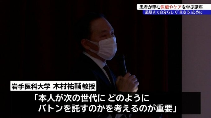 講師を務めた岩手医科大学・緩和医療学科の木村祐輔教授は「本人が次の世代にどのようにバトンを託すのかを考えるのが重要」とした上で「家族や医療者と将来に対する考えや価値観を共有してもらいたい」と呼びかけました。