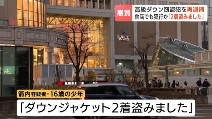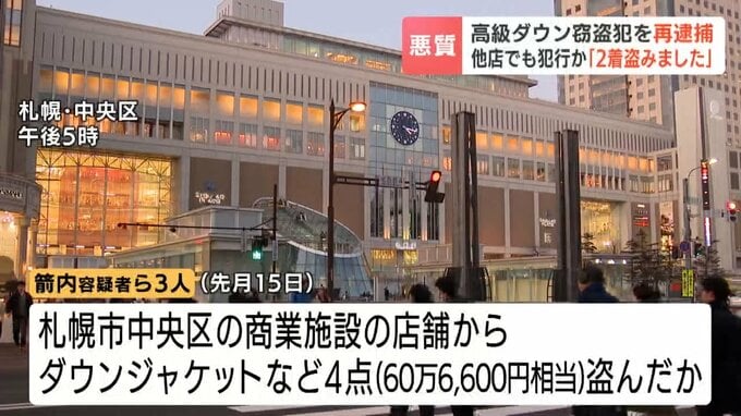 10月、札幌市北区の店舗から高級ダウンジャケットを盗んでいた男ら3人が、札幌駅近くの商業施設でも約60万円の高級ダウンジャケットを盗んだ疑いで逮捕されました。