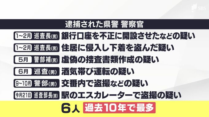 県警をめぐっては9月に警部の男が交番で盗撮をした疑いで逮捕・起訴されるなどしていて、2025年に入って5人の警察官が逮捕されていました。今回の事件で逮捕者は6人となり、過去10年で最多です。