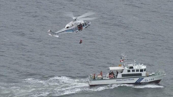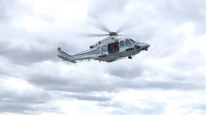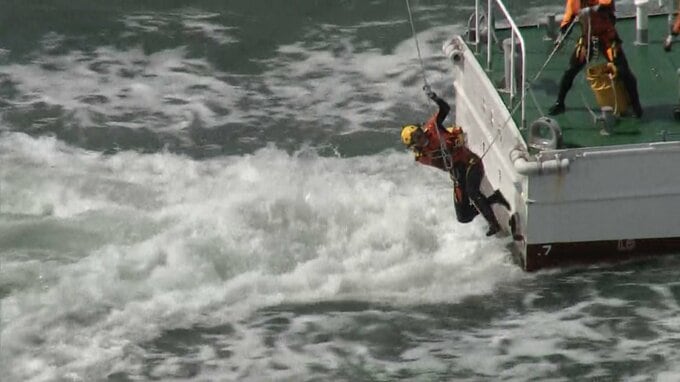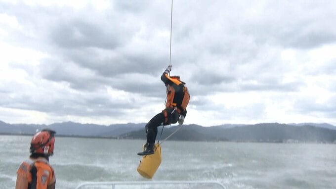 訓練に臨んだ山林さんは船とヘリコプターが重なった瞬間に約12メートルの高さから降下。