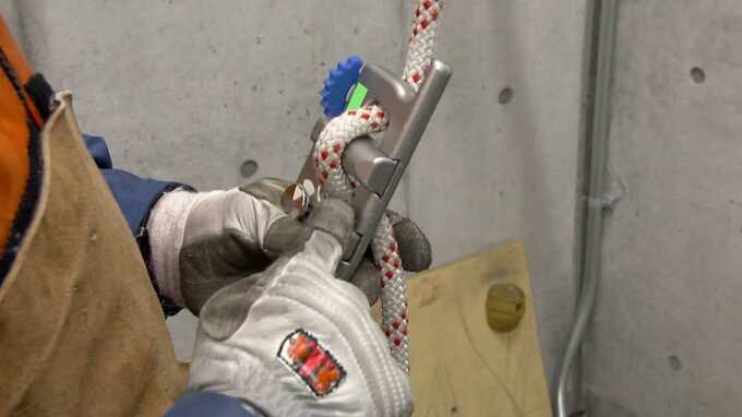 「こういう折れ曲がる状態になっていて、そもそもここで摩擦が効くんですけど、それだと落ちちゃうので、自分の体の摩擦と後ろで握っているので、ぶら下がっても落ちない、手を離すと落ちる」