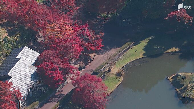 「伊豆・修善寺の虹の郷かいわいの上空です。遠くから見ていても紅葉の赤が印象的です。えんじ色にも見える深い赤、そしてオレンジ、さらには芝生の緑、広がる池、この時期ならではの光景です」