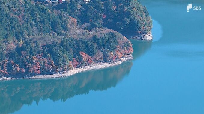「静岡市の山間にある井川湖です。湖のそばの木々が色付いています。そして、その紅葉が湖に反射しています。湖に映る紅葉も見応えがあります。井川と言えば、県内屈指の寒い地域ですけれども、短い秋の美しい光景が広がっています」