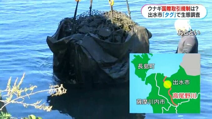 鹿児島県出水市を流れる高尾野川の河口です。この日、地元の漁協がウナギの生態調査のために2年前に設置した、石を敷き詰めたかごを引き上げました。