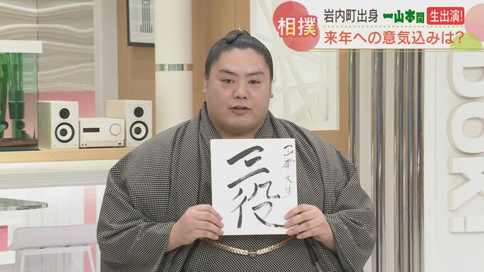 「来年の目標は三役」と書かれた色紙を掲げた一山本関。11勝4敗という好成績で、初場所での三役昇進も現実味を帯びてきました。「まだ会議してないので僕には全然わかんない」としながらも、「三役場所を狙える位置には来る」と手応えを語ります。