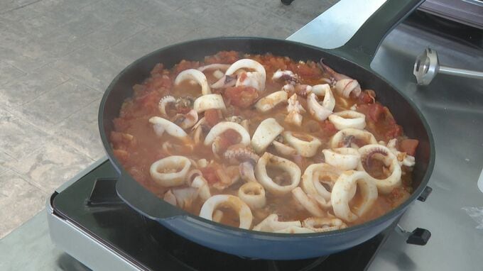 料理はセート風イカの煮込みです。南フランスの郷土料理で地元、仙崎のイカをトマトソースで煮込みます。