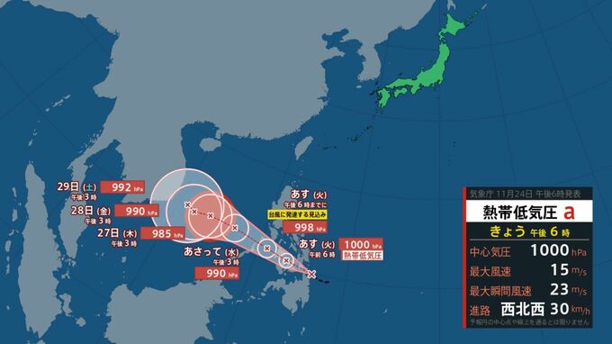 気象庁によりますと、ミンダナオ島の東で熱帯低気圧が発生しました。熱帯低気圧は、きょう(24日)午後6時には、ミンダナオ島の東で1時間に30キロの速さで西北西へ進んでいます。