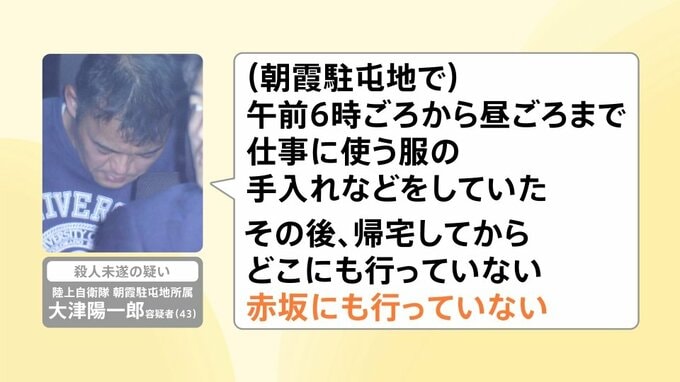 大津容疑者は、逮捕前の任意の取り調べに対して「(朝霞駐屯地で)午前6時ごろから昼ごろまで、仕事に使う服の手入れなどをしていた。その後、帰宅してからどこにも行っていない。赤坂にも行っていない」と供述しています。