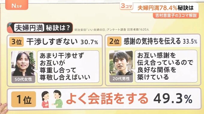 50代女性は「あまり干渉せず、お互いが尊重し合って尊敬し合えばいい」、また20代男性は「お互い感謝を伝え合っているので、良好な関係を築けている」と夫婦円満の秘訣を話していました。