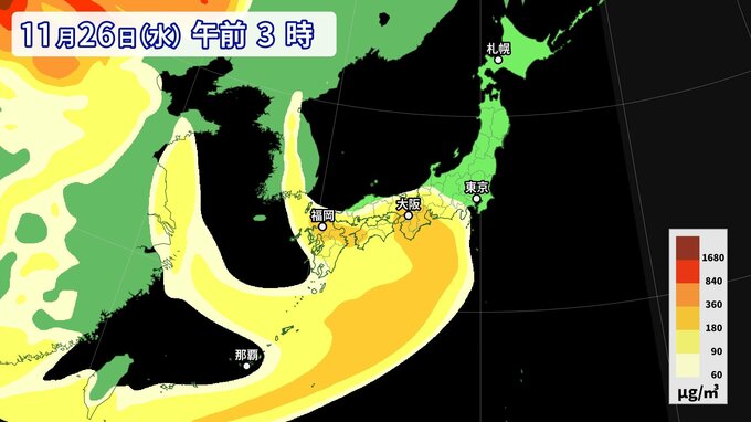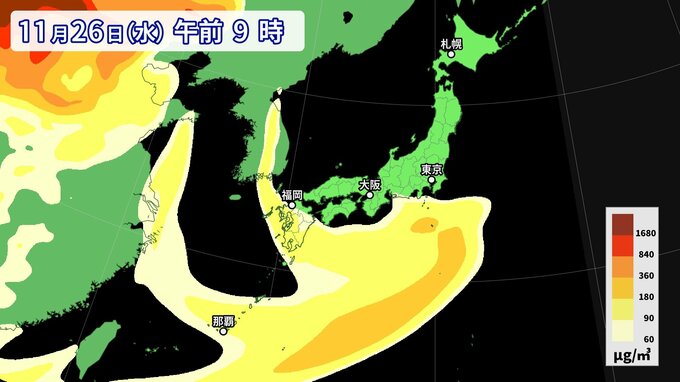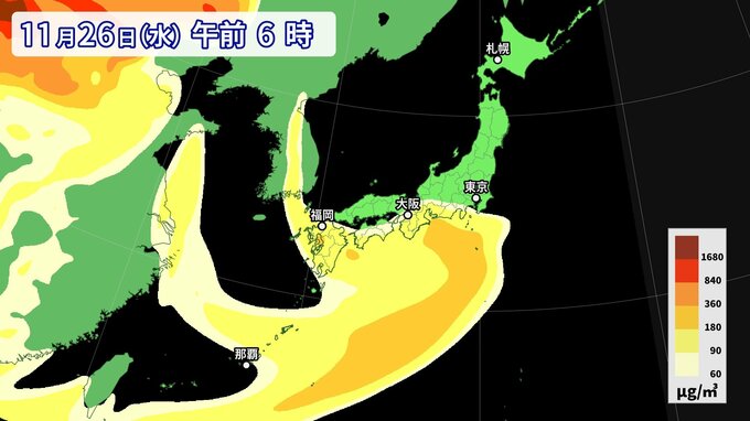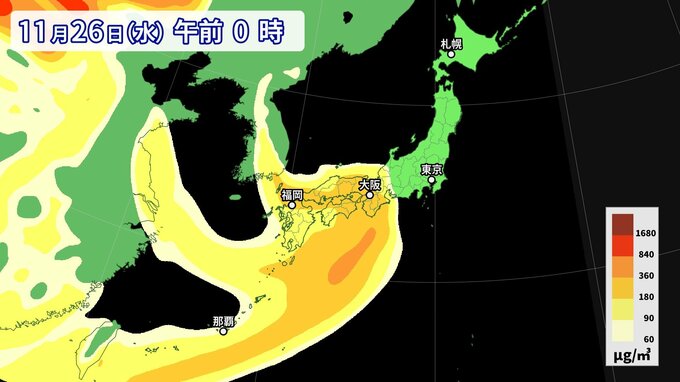 【黄砂情報】11月なのに黄砂…26日にかけて西日本から南西諸島の広い範囲に影響か 週後半にも再び飛来の可能性【最新・黄砂シミュレーション】