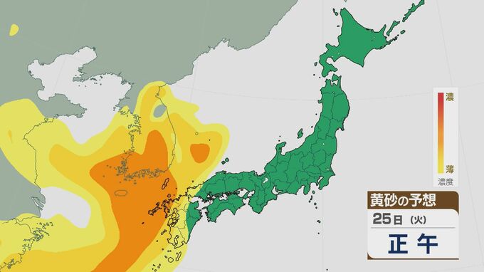 25日(火)は、九州から近畿・東海にかけて黄砂が飛来する見込みです。26日(水)の日中以降はいったんおさまるものの、27日(木)から28日(金)にかけて再びやってきそうです。