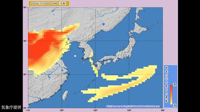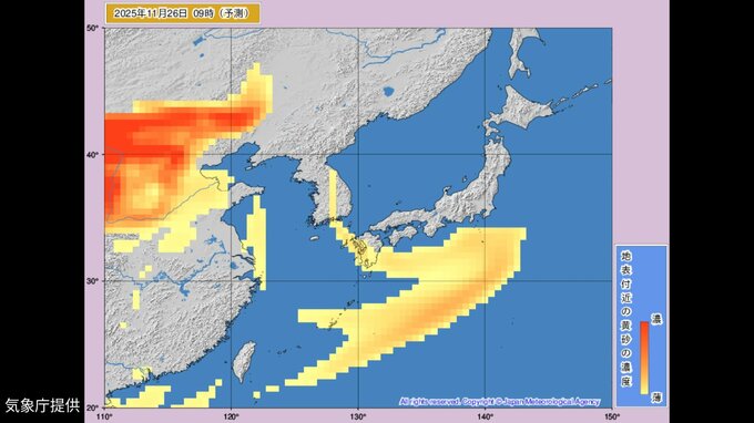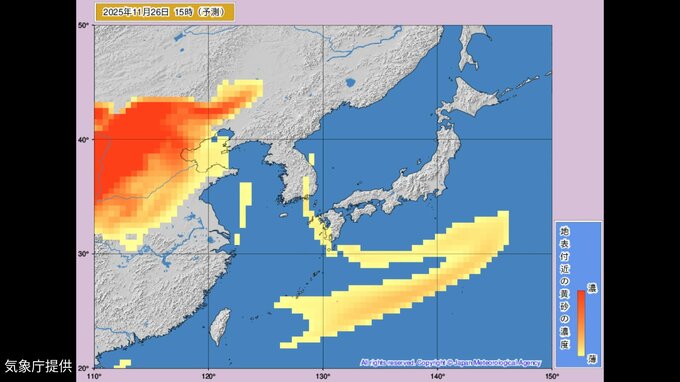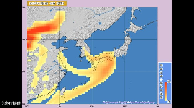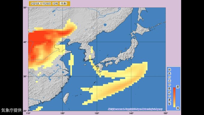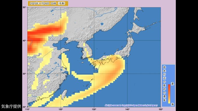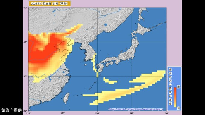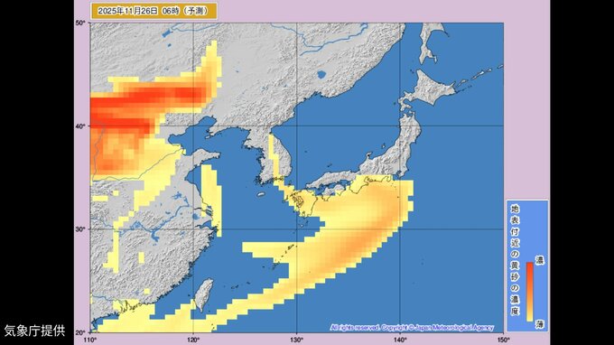 【黄砂予測】きょう(25日)西日本に飛来 あす25日(水)に関東地方の一部地域にも飛来する見込み【気象庁シミュレーション 25日午前9時更新】 RSK山陽放送 2025年11月25日(火) 09:46 国内 26日(水)の黄砂はどうなる? 26日(水)の黄砂のシミュレーションは、【画像⑦~⑭】のとおりです。 【画像⑦】 【画像⑧】 【画像⑨】 【画像⑩】 【画像⑪】 【画像⑫】 【画像⑬】 【画像⑭】