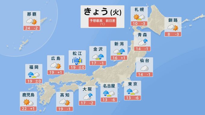 25日は、九州から東北まで雨やくもりの天気になるところが多いでしょう。