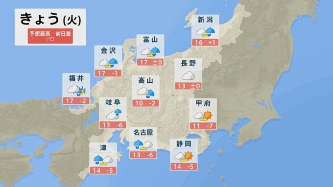 北陸など日本海側では雷をともない雨が強まるところがありそうで