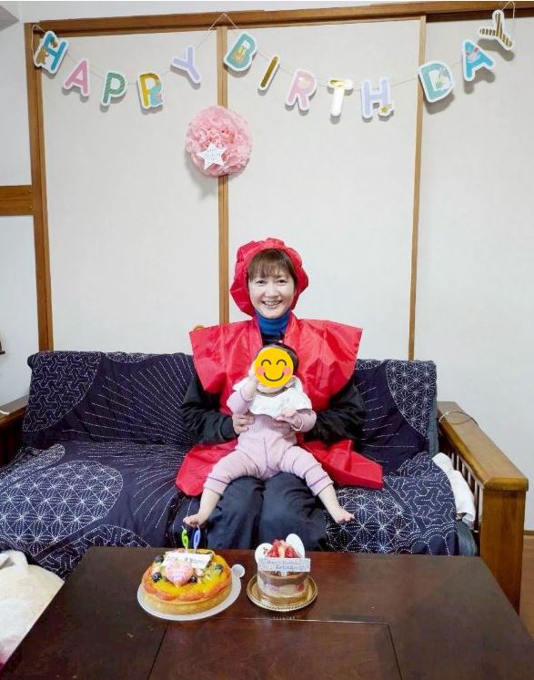 赤い帽子に赤いちゃんちゃんこを羽織った古村さんが、HAPPY BIRTHDAYの飾り付けがされた部屋で、お孫さんとみられる赤ちゃんを抱く画像が添えられています。