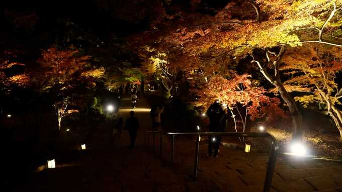 縁結びの神様として知られる竈門神社では紅葉のライトアップが始まっています。