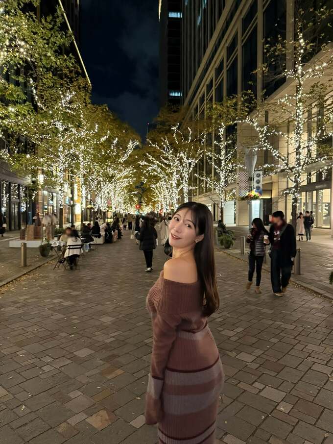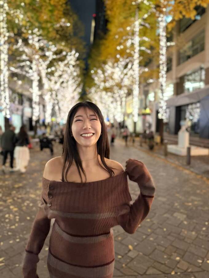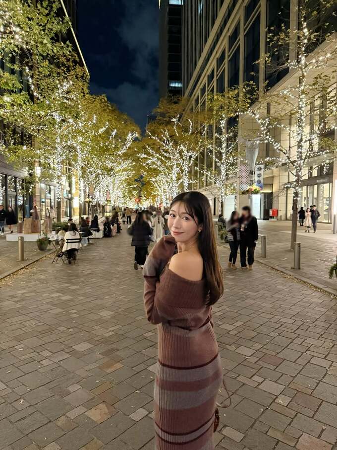 穂川さんは「今年もイルミネーションハンター活動はじめました」「今回は毎年恒例の丸の内です!」とテキスト。道行く人たちが比較的厚手の上着を着ている中、穂川さんはニットの肩出しワンピースドレスを袖口を余らせつつ着こなして、イルミネーションを背景に得意の “見返りポーズ” を投稿しています。