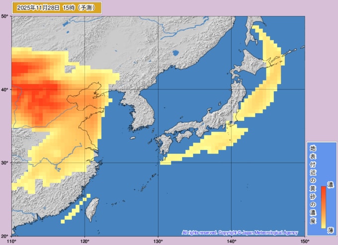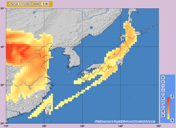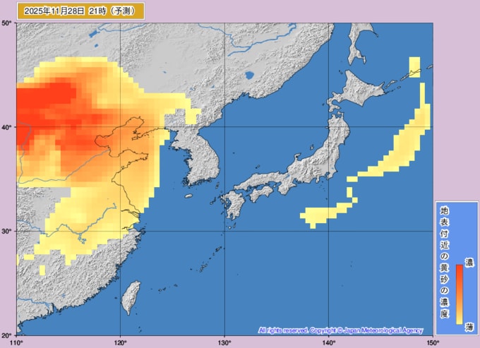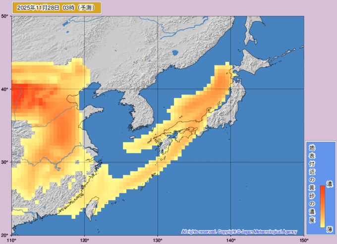 【黄砂情報】冬間近に黄砂襲来か… 25~26日は西日本を中心に 27~28日は日本の広い範囲に“黄砂の影” いつ・どこに飛んでくる?【黄砂の予想シミュレーション・気象庁「黄砂解析予測図」あり】 青森テレビ 2025年11月25日(火) 16:15 国内 【28日】気象庁の黄砂情報「黄砂解析予測図」 ※画像は気象庁HPより