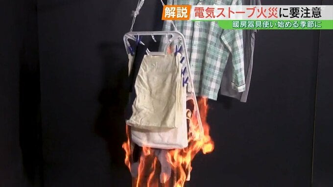 寝室で燃えている掛け布団。燃えながら、崩れ落ちる洗濯物。これは、NITE=「製品評価技術基盤機構」が行った実験の映像で、どちらも電気ストーブの接触が火災を引き起こしています。