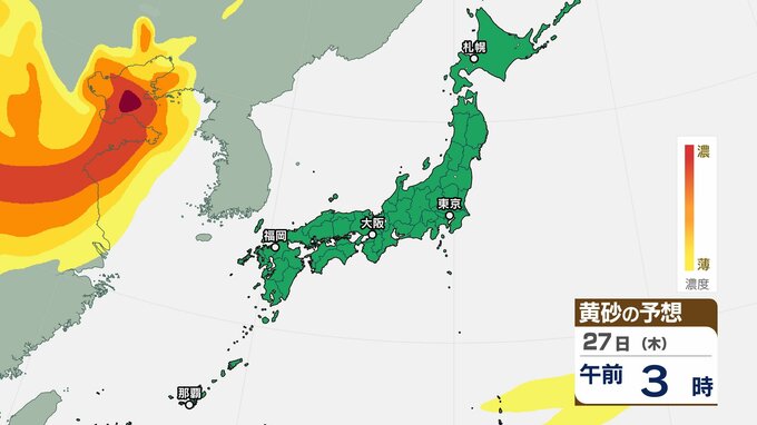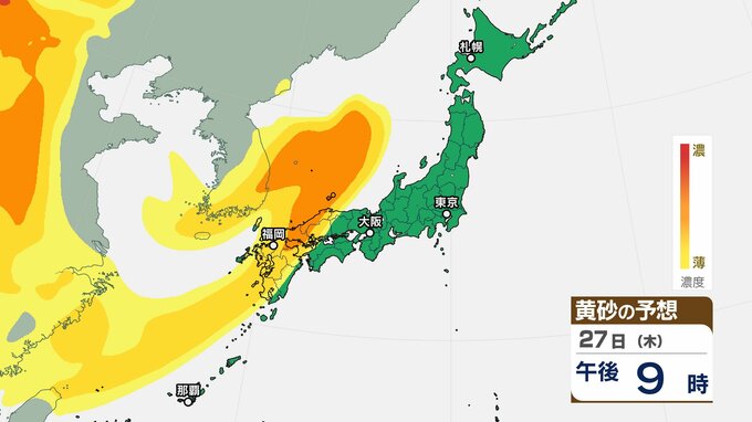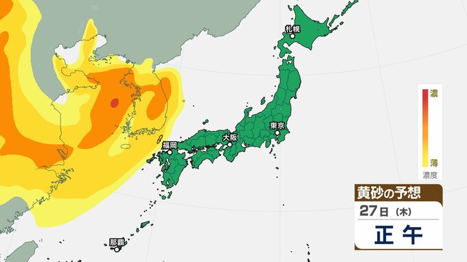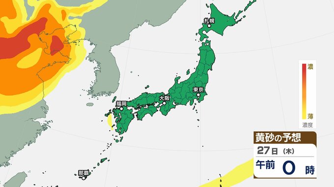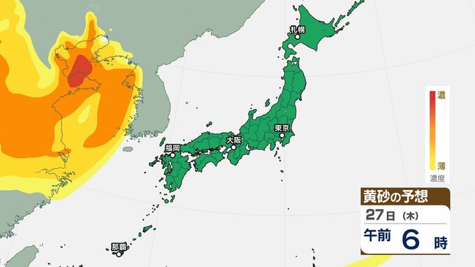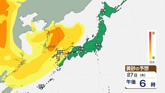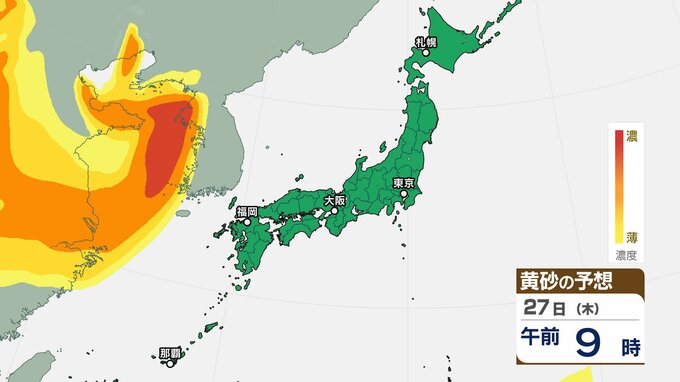 【黄砂予測】あす26日(水)「西日本が黄色に染まる…」 東海や関東の一部にも飛来予測 26日~28日にかけての黄砂シミュレーション【気象庁 25日午後4時更新】 RSK山陽放送 2025年11月25日(火) 16:00 国内 27日(木)の黄砂はどうなる? 27日(木)の黄砂のシミュレーションは、【画像⑩~⑯】のとおりです。 【画像⑩】 【画像⑪】 【画像⑫】 【画像⑬】 【画像⑭】 【画像⑮】 【画像⑯】