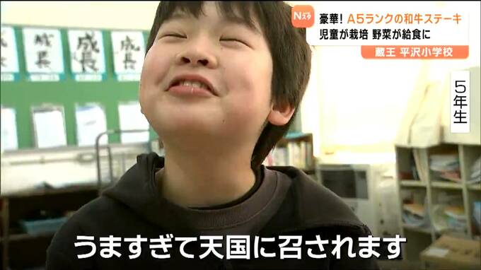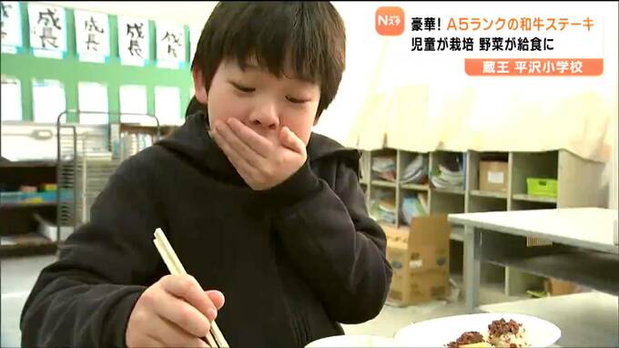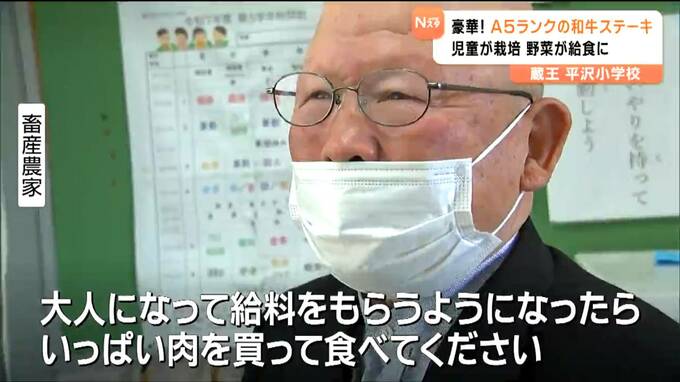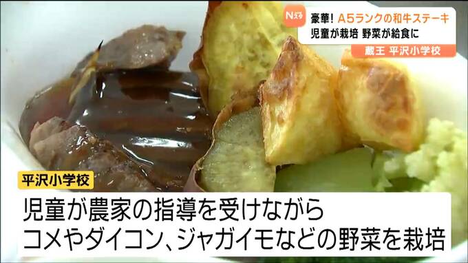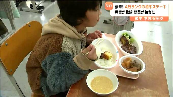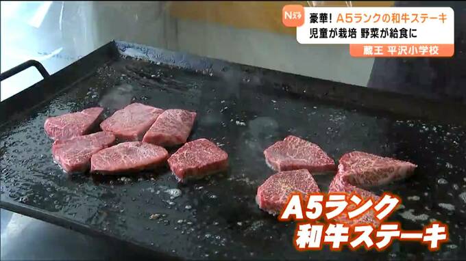 一方、蔵王町の平沢小学校で振る舞われたのは、地元の畜産農家が育てたA5ランクの和牛のステーキです。