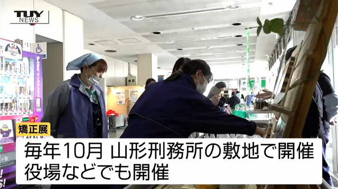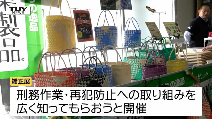 山形刑務所の受刑者などが作った木工品や革製品などを展示・販売する「矯正展」が初めて県庁で開かれ、刑務所や制度への理解を求めました。