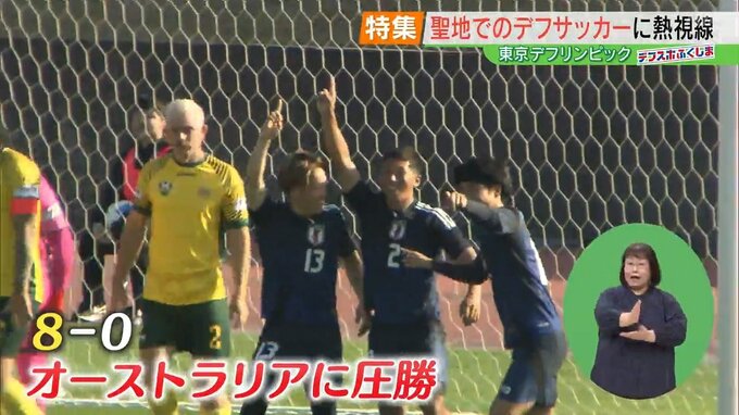 最初の試合は、男子の日本対オーストラリア。日本代表の初戦を見ようと、多くの観客が詰めかけました。初めての日本開催となったデフリンピック、日本の選手たちがピッチで躍動しました。日本のゴールラッシュで、8対0の圧勝。メダル獲得へ弾みをつける白星発進でスタートを切りました。