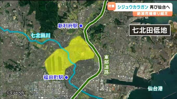 七北田川を挟んで仙台市と多賀城市にまたがる「七北田低地」。