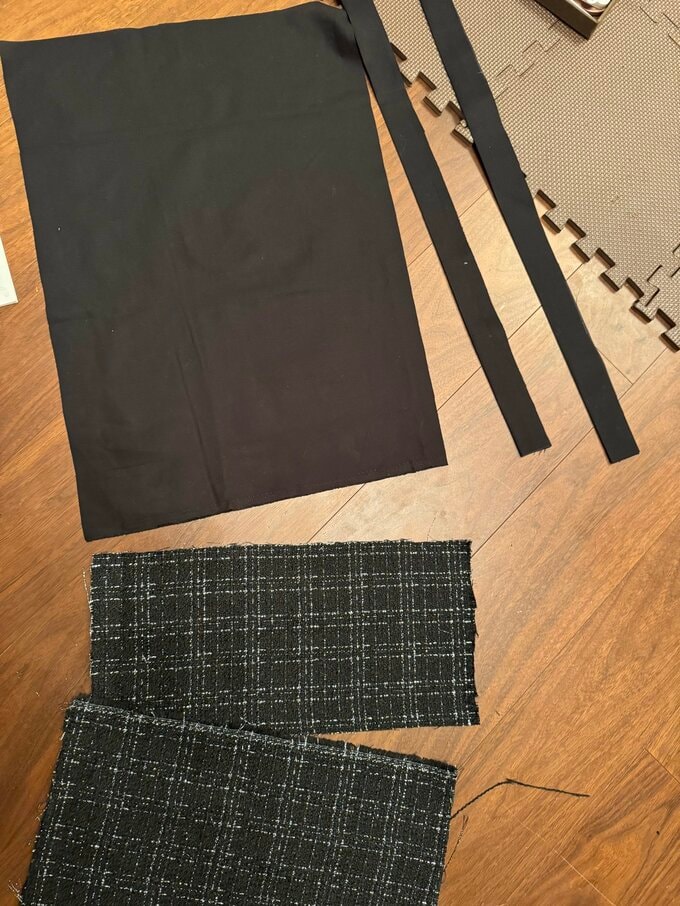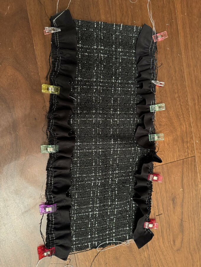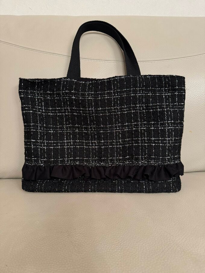 写真からは、黒地に白の格子模様のツイード調の生地を使用し、黒いフリル状のギャザーを施した手提げバッグを完成させた様子が伝わってきます。