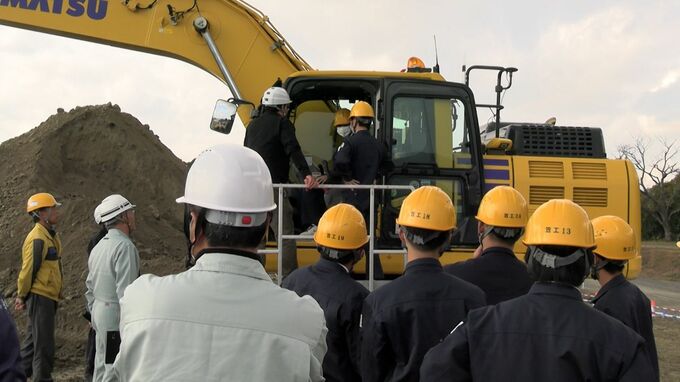 人が乗っていないショベルカーが動きます。笠岡市の国道の工事現場で開かれた建設機械の見学会です。岡山市北区の三幸工務店が情報通信技術を活用した工事の効率化と省人化への取り組みを高校生に知ってもらおうと実施したものです。